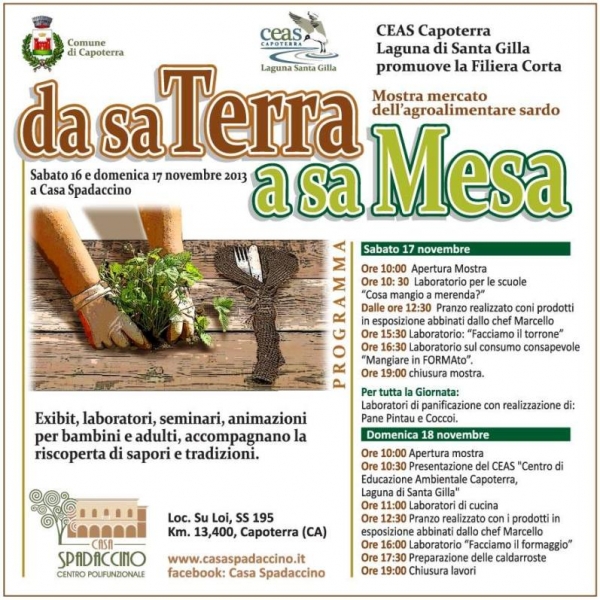 Sabato 16 e domenica 17 mostra mercato dell'agroalimentare sardo a Casa Spadaccino nel comune di Capoterra. La manifestazione è organizzata dalla Ceas, Centro di Educazione Ambientale e alla Sostenibilità , nel centro polifunzionale di Su Loi che avvia la sua attività con una manifestazione di promozione della filiera corta.Una mostra mercato dei prodotti agroalimentari sardi accompagnata da laboratori, seminari, animazioni per bambini e adulti. Per tutta l'intera giornata di sabato sarà presente il laboratorio di panificazione con la realizzazione di Pane Pintau e Coccoi.